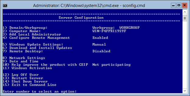 If you installed Windows Server in Core mode, then you’ll just be dumped to a black screen with a command prompt and a blinking cursor. Hyper-V Server’s welcome is a little bit friendlier, as it also has a window with the Server Configuration tool visible by default. Don’t fret if you’re using Windows Server; just type the following at the command prompt:
