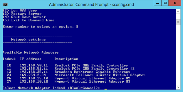 For now, use option 8 in the Server Configuration tool to begin setting up networking. You’ll be presented with a list of all adapters that are plugged in and enabled: