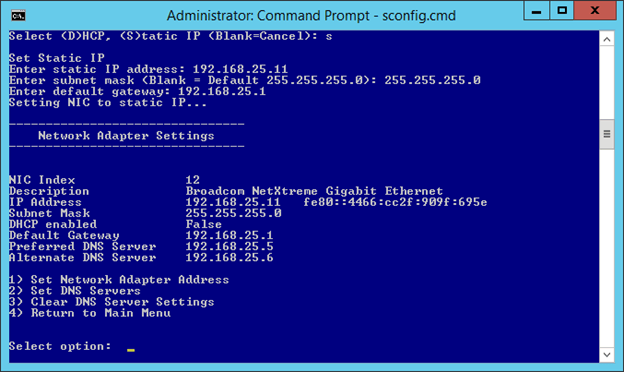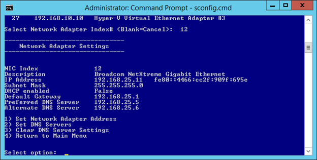 Enter the IP information first. Type the number 1 and press [Enter]. You’ll then be prompted with “Select (D)HCP, (S)tatic IP (Blank=Cancel):”. Hyper-V works best with static IP addresses, so hopefully you’ve got one in mind. Press S and [Enter]. After that, you’ll be prompted for the IP, subnet mask, and gateway to use for this connection. Upon entering them, you’ll be returned to the Network Adapter Settings screen: