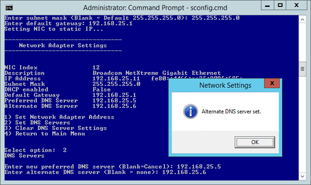 Next, enter the DNS servers. Press 2 and [Enter]. You’ll be prompted for primary and secondary DNS servers with a confirmation dialog after each: