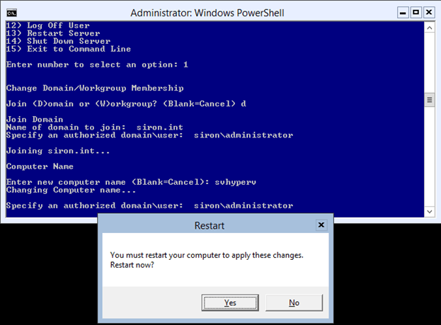 In Server Configuration, type 1 and press [Enter]. You’ll be prompted to choose workgroup or domain mode. You’re already in workgroup mode, so type D and press [Enter]. You’ll be prompted first for the domain name. After providing that, you’ll be given a prompt for a username; it’s recommended that you enter it in DOMAIN\User format. After that, a new window will pop-up where you can enter your password without the characters being echoed to the screen.