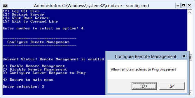 We’ll start with Server Configuration option 4, “Configure Remote Management”. This will show “Enabled” by default. The option to allow Ping requests is not enabled by default. If you wish to enable it, access this menu and press 3 and [Enter]. Choose to allow or disallow it from the dialog:
