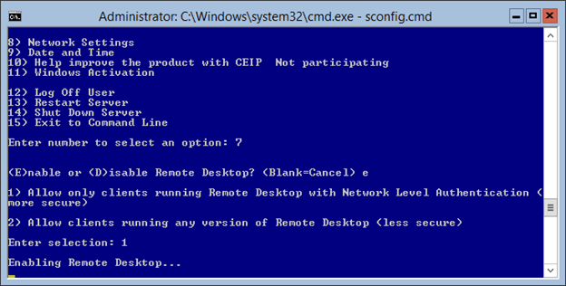 Inbound Remote Desktop connections are blocked by default. Choose number 7 from the main menu to access the option to change it. Type E and [Enter] to enable Remote Desktop. You’ll be asked if you want to allow only clients using Network Level Authentication technology or any RDP client. Modern Windows clients all use NLA, but some organizations allow access from devices running other implementations of Remote Desktop clients. Choose the option according to your needs: