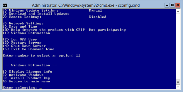 The last action to take in Server Configuration is to activate Windows using option 11. This choice does not appear in Hyper-V Server; that menu only has 14 items.