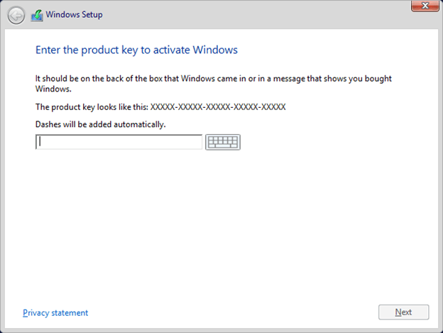 Clicking Install Now will take you to one of two screens. If your installation disk is for a fully licensed copy of Windows Server, then you’ll be prompted to enter your license key: