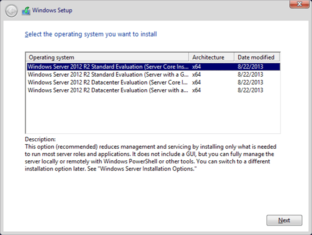For all other installation media (Windows Server or Hyper-V Server), the above screen will not be shown. For all Windows Server media, the next screen is to select which operating system to install. If you are using fully licensed media, then your options will be limited to those available to the license key that you entered. For evaluation media, you’ll be allowed to choose from all editions that are on the image, as shown in the following screenshot: