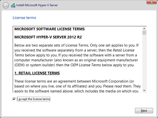 The installation of Hyper-V Server is nearly identical to that of Windows Server in Core mode. These steps will intertwine both, noting any steps that are unique to either product.
