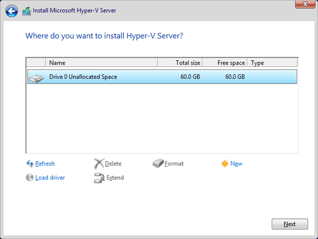 The system used in this demonstration has a very small disk area set up just to run Hyper-V. If you have a larger storage area that you’d like to break into pieces, use the New text button to create at least the installation location. The management operating system’s partition must be at least 32 GB in size to meet Microsoft’s minimum recommendations, but this is usually much too small in practice due to patching and other activities. A safer minimum size would be 60 GB.