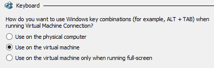 Notice that the Keyboard tab is under the User section; this, and the other two tabs, apply only to the user that is currently running Hyper-V Manager. All the previous settings are global to the host. The keyboard options are shown below: