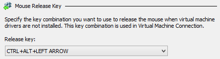 The next tab, Mouse Release Key, is only used for virtual machines that do not have Integrated Services installed (usually Linux). The VM Connect utility won’t be able to seamless transition mouse focus from your local station to the connected virtual machine and back, so you’ll need to use a key combination that VM Connect can trap as a signal that you wish to return to your local computer. You can configure select that key combination on this tab.