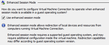 The Enhanced Session Mode controls advanced features available in remote connections to virtual machines that make use of VM Connect’s capabilities. While this hasn’t been demonstrated yet, it’s the connection that’s made to a virtual machine using Hyper-V. These features include the ability to take advantage of more screen resolutions and remote drag-drop functionality. The virtual machine must be running Windows Server 2012 R2 or Windows 8.1 or later for any of the features to work and the “Hyper-V Guest Service Interface” service must be running inside the guest to enable full functionality.