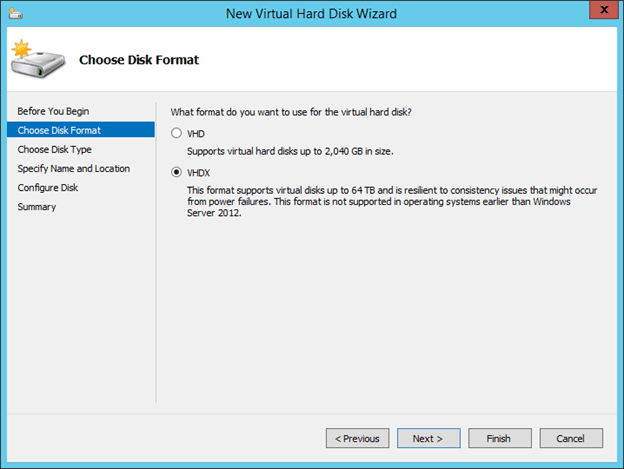 3. Choose whether to create a disk of the original VHD or the new VHDX type. Click Next.