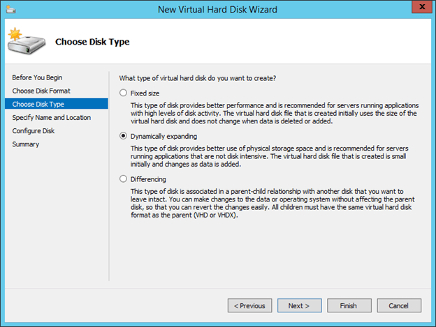 4. Choose whether the disk should be Fixed, Dynamically Expanding, or Differencing. Dynamic is the default type and should be used unless you have a clear requirement for one of the others. Click Next.