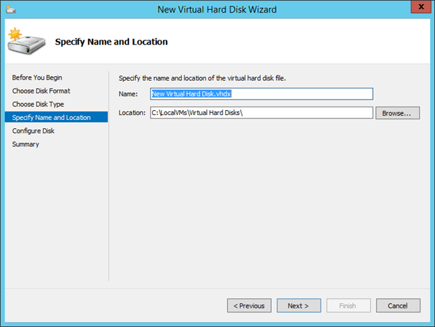 5. Choose the name and the location for the new virtual hard disk. Click Next.