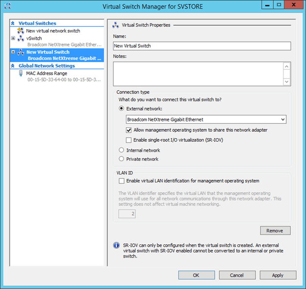 It’s not really recommended to use the GUI to create a virtual switch, as there are a number of features that cannot be controlled this way and cannot be changed later. However, it’s perfectly acceptable to use for internal and private virtual switches and relatively harmless for external virtual switches in small environments. In any case, it’s a good idea to at least be familiar with the interface even if you think you might never use it.