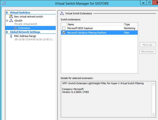 By default, the only available extensions are the “Microsoft NDIS Capture” extension that allows for packet monitoring and the “Microsoft Windows Filtering Platform” that provides packet filtering capabilities. Other extensions must be installed to the host before they will appear.