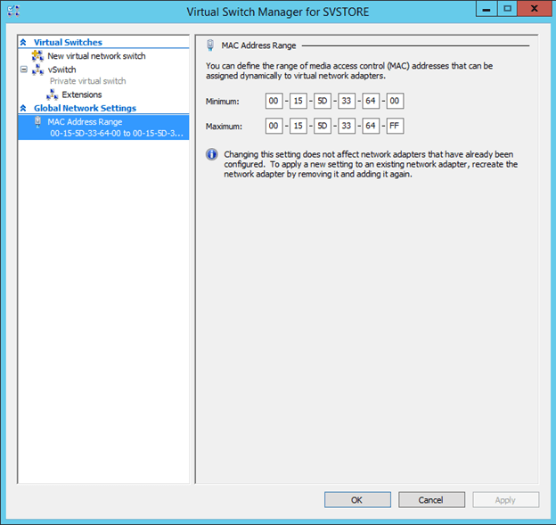 Each Hyper-V host automatically assigns MAC addresses to all virtual adapters that are created on that host and dynamically re-assigns MAC addresses to guests that are migrated to it. This MAC address range begins with the octets 00-15-5D, which is a range owned by Microsoft. The last three are generated when Hyper-V is installed and are based on a MAC address of a physical adapter. Usually, you won’t have to change this. However, if you find that you are experienced MAC address collisions in your network, it is possible that one or more Hyper-V hosts have the same range. You can override the default MAC range used by a host by accessing the MAC Address Range tab of the Virtual Switch Manager: