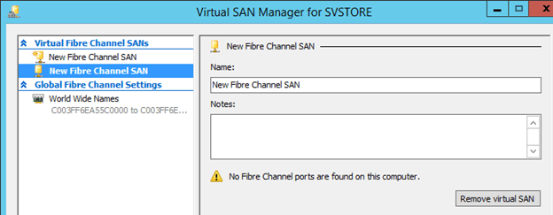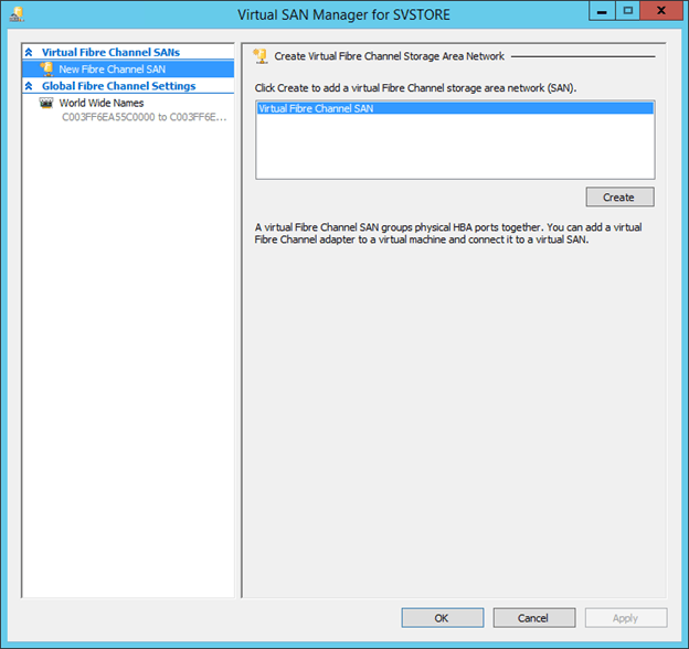 A feature that Hyper-V provides is the ability to expose a virtualized fibre channel adapter to guests. This functionality is quite similar to the virtual switch, except that there is no purely virtual option. To access this feature, use the Virtual SAN Manager item on a host’s context menu. You’ll be presented with the following dialog: