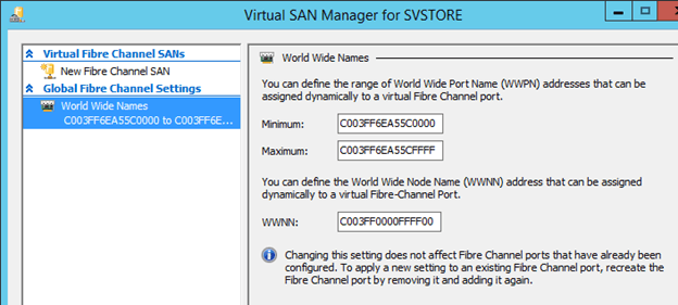 In the Virtual SAN Manager, you can set the WWPN range and WWNN address that will be used by virtual fibre adapters. Select the World Wide Names tab and you’ll be shown the following screen: