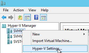 Right-click on the server in the left pane and click Hyper-V Settings: