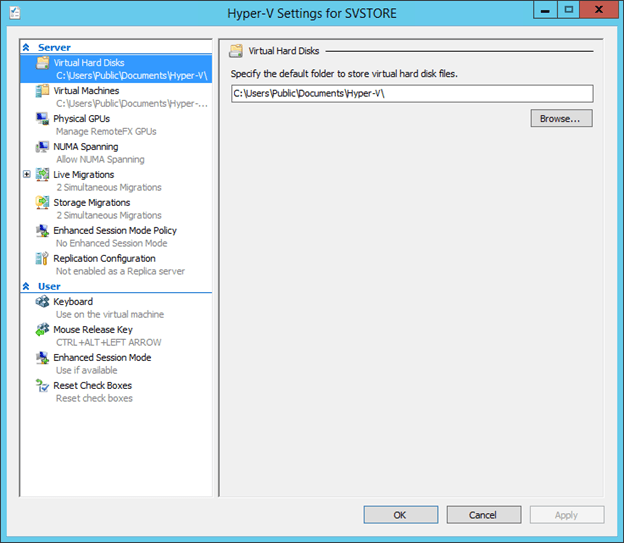 This will bring you to the Hyper-V Settings dialog for the selected server. That dialog appears below and will be referred to throughout this section:
