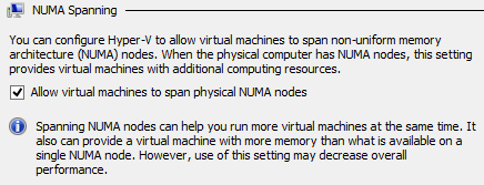 Non-Uniform Memory Access is another important, yet in-depth topic that can only be summarized here. When your host contains more than one filled CPU socket, access to individual memory slots must be arbitrated by the CPU that “owns” that socket. When NUMA is enabled (this is a physical host setting), Hyper-V will attempt to keep the virtual CPUs that belong to a virtual machine on the same NUMA node (usually the cores of a single socket). It will also attempt to keep memory that belongs to a particular thread running on memory that is “owned” by the same physical CPU. However, depending on conditions, that may prove to be impossible. If that occurs and the Allow virtual machines to span physical NUMA nodes box is checked, Hyper-V will allow a VM’s virtual CPUs to be assigned to cores on different NUMA nodes and will allow their threads to access memory on different NUMA nodes.