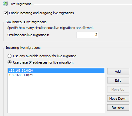 If the Enable incoming and outgoing live migrations box isn’t checked, then the host will not participate in Live Migrations with hosts that are not in the same cluster. In other words, a host that is a cluster member will always be able to Live Migrate to and from other cluster nodes. As a result, this setting only applies to standalone hosts and migrations that would span a cluster.