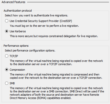 Under Performance options, you can select the Live Migration transmission method that is most suitable for your configuration. The TCP/IP method uses standard transmission methods without any enhanced features. It is the slowest method, but also the least demanding of system resources. The Compression method is preferred in most cases. It uses physical CPU resources to compress the contents of a virtual machine’s memory prior to transmission. Since there is almost always more available CPU power than networking bandwidth, this usually results in a very good tradeoff of resource utilization. The SMB mode is preferred when high-powered network adapters are in use that can accelerate SMB traffic with technologies such as RDMA (Remote Direct Memory Access). If there are multiple adapters and SMB multichannel is available, it will be utilized. If RDMA-capable hardware is not available, then compression almost always provides superior performance.