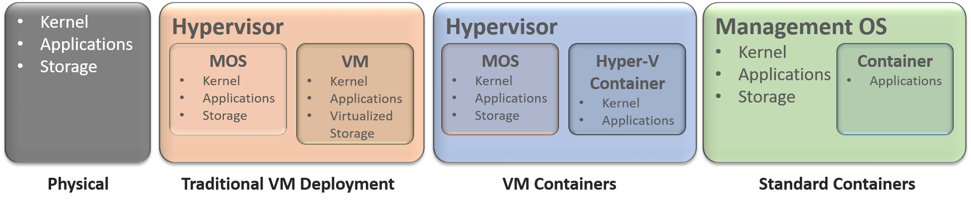 Yes… and no. For any given service or system, you will need to pick one and stick with it. Physical and virtual machines don’t differ much, but each of the choices involves radical differences. Switching to a completely different deployment paradigm would likely involve a painful migration. However, the same Hyper-V host(s) can run all non-physical options simultaneously. Choose the best option for the intended service, not by the host. I can see a case for segregating deployment types across separate Hyper-V and Windows Server hosts. For instance, the Docker engine must run on any host that uses containers. It’s small and can be stopped when not in use, but maybe you don’t want it everywhere. If you want some systems to only to run Windows containers, then you don’t need Hyper-V at all. However, if you don’t have enough hosts to make separation viable, don’t worry about it.