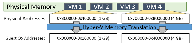 The technique that Hyper-V uses to achieve this is address translation. As you may recall from the introductory article on Hyper-V, the Hyper-V server role benefits greatly from hardware-based translation, called Second Level Address Translation, although it can perform it in software if necessary. 2012 R2 is the last server version that will include this software capability; Client Hyper-V has never had it. The following diagram provides a conceptual illustration of address translation: