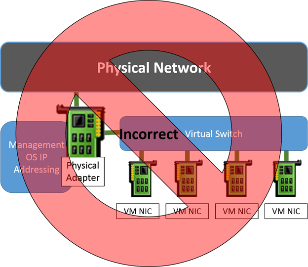 Unfortunately, this is not at all an accurate representation of Hyper-V’s virtual network stack. Once the virtual switch is bound to a physical adapter, that adapter is no longer used for anything else. TCP/IP, and most other items, are removed from it. The management operating system is quite simply unable to “share” it. If you attempt to bind anything else to the adapter, it’s quite probable that you’ll break the virtual switch.
