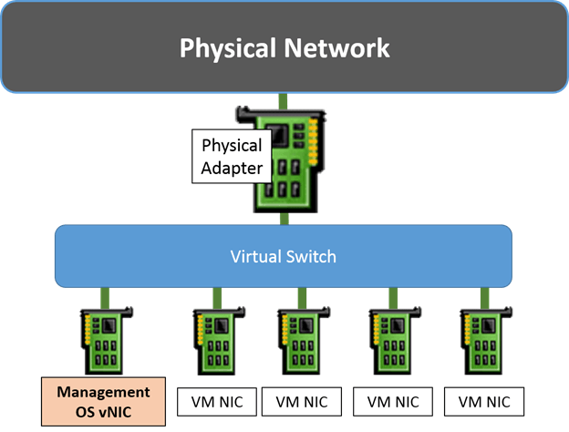 In truth, the management operating system is getting a virtual network adapter of its own. That’s what gets connected to the virtual switch. That adapter isn’t exactly like the adapters attached to the virtual machines; it’s not quite as feature-rich. However, it’s nothing at all like actually sharing the physical adapter in the way that the controls imply. A better term would be, “Connect the management operating system to the virtual switch”. That’s what the settings really do. The following image is a much more accurate depiction of what is happening: