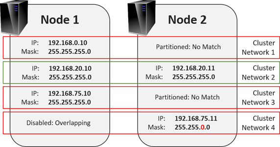 In the illustration, the only valid network is Cluster Network 2. The worst is Cluster Network 4. Due to the way the subnet is configured, it overlaps with all of the other networks. The cluster service will automatically lock the node 2 adapter with IP address 192.168.5.11 out of cluster communications and mark the network as None to indicate that it is disallowed for cluster communications.