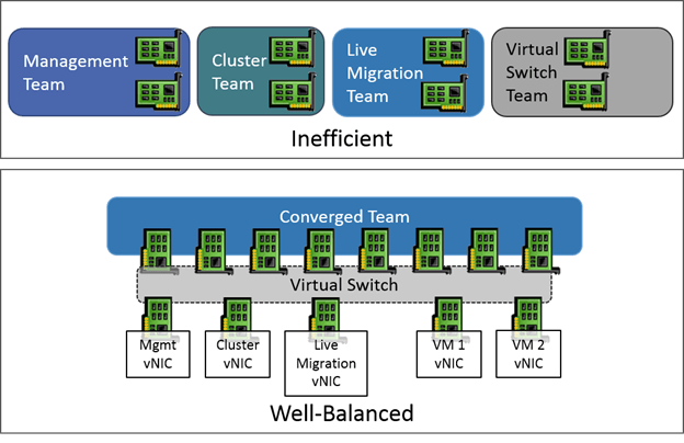 While the most common convergence typically binds all adapters of the same speed into a single channel, that’s not a requirement. You may use one team for virtual machine traffic and another for the management operating system if you wish.