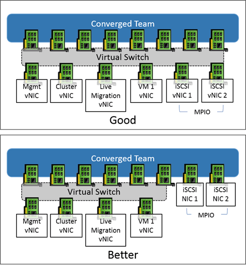 • If iSCSI and/or SMB connections are made through virtual adapters on a converged team, they will establish only one connection per unique IP address. Create multiple virtual adapters in order to enable MPIO and/or SMB multichannel.