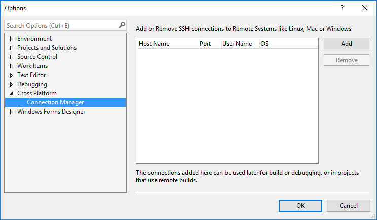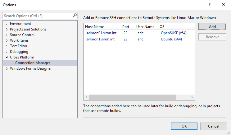 When you click Connect, Visual Studio will validate your entries. If successful, you’ll be returned to the Options window. If not, it will highlight whatever it believes the problem to be in red. It does not display any errors. If it highlights the host name and port, then it was unable to connect. If it highlights the user name and key section, then the target system rejected your credentials. If that happens, verify that you entered the ssh-copy-id command correctly.
