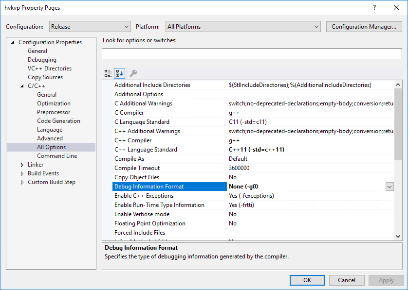 TIP: In Release mode, VC++ sets the Debug Information Format to Minimal Debug Information (-g1). I’m not sure if there’s a reason for that, but I personally don’t look for any debug information in release executables. So, that default setting bloats my executable size with no benefit that I’m aware of. Knock it down to None (-g0) on the C/C++/All Options tab (make sure you select the Release configuration first):