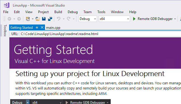 Your new project will include an introductory home page and a default main.cpp code file. The Getting Started page contains useful information: