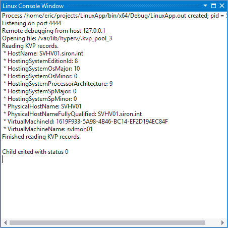 Microsoft has definitely been bringing the love for Linux lately! I’ve used Linux more in 2017 than in the entirety of my previous career combined. Microsoft made that happen. Recently, they added support to their premier development product, Visual Studio, so that it can connect, deploy, and debug C/C++ code on a Linux system. I’m going to show you how to use that new functionality in conjunction with Hyper-V to ease development on Linux. I’ll provide a demo program listing that you can use to retrieve the information that Hyper-V provides to Linux guests via KVP exchange.