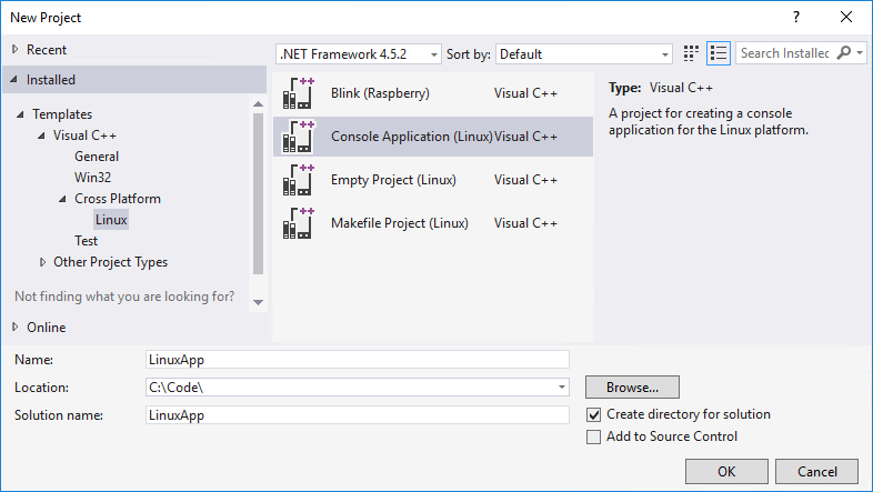 - In the New Project dialog, expand Installed -> Templates -> Visual C++ -> Cross Platform and click Linux.