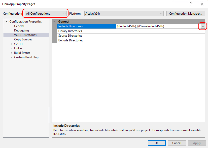 On the VC++ Directories tab, you can configure the include directories that Visual Studio knows about. This tab does not influence anything that happens on the target Linux system(s). The primary value that you will get out of configuring this section is autocomplete and Intellisense for your Linux code. For example, I have set up WinSCP to synchronize the include files from one of my Linux systems to a named local folder:
