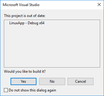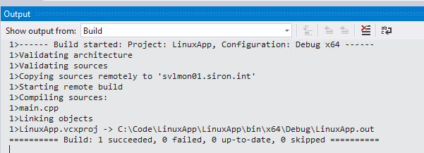 - During a build operation, Visual Studio transfers the source files to the target Linux system. It calls on the local compiler to build them.