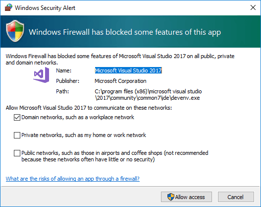 If you’ve left the Windows Firewall active, you’ll need to allow Visual Studio to communicate out: