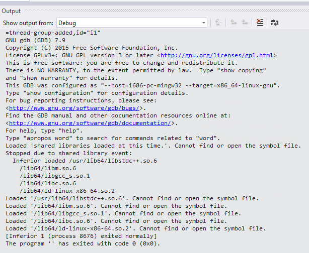 - During a debug operation, Visual Studio calls on the local gdb installation. It brings the output to your local system.