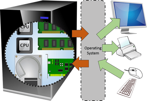 We’ll begin with the familiar computer. You start with the hardware. This is made of the motherboard and the CPU and the memory and the hard drive and the monitor. An operating system is the first layer of software that gets installed. Its primary job is to corral all that hardware, ensuring that all the bits get where they need to go. Part of its function is accepting input from devices such as the keyboard and mouse devices. A related job is directing output to the screen, printers, and other devices.